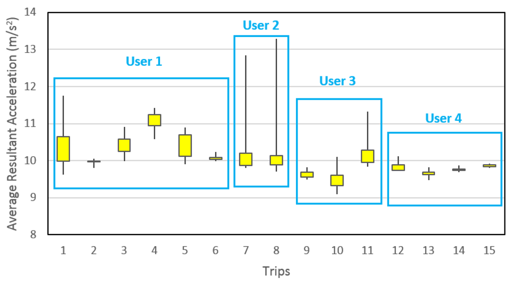 This explains why moving window was used but does not justify the large window size selected, which might result in excessive overlapping and consequently high prediction accuracies. The reason for using this approach lies in the real world application design of the developed methodology. Generally, people have unique walking and driving patterns, even if they usually stick to a distinctive routine while commuting daily via public transportation. To predict the mode of transportation of a person by studying a completely different person might not yield better results. However, if the prediction is done by studying limited data yielded from the same person, the accuracy will certainly be much better. As the algorithm requires training data, the application design is such that the participants will be asked to at least annotate one day’s data (encouraged by providing some incentive like free cinema tickets, gift vouchers, etc.), all of which will be regarded as the training data. After that, the participants just need to keep the application running in the background for the intended period of the survey. In such a design, the big window size does not pose a problem; in fact, it helps to achieve higher prediction accuracy by smoothening the data and bringing it near to the training data. To explain this, Figure 13 demonstrates the average resultant acceleration values, calculated by a 10 min moving window, for first day walking trips made by four participants only. It is evident from the figure that large window size brings the average resultant acceleration data for each trip, by a particular participant, closer to an average value. Hence, it allows the correct prediction within each participant’s data. Note that the figure shows only one feature. When assisted with a number of other features, the prediction process becomes efficient. This is the probable reason behind the extraordinarily high detection accuracies achieved in this study. To include randomness into the present analysis, the training data were randomly selected rather than taking entire trips. The aim is to assist the travel data collection survey; therefore, the predictions need not to be in real-time. Needless to say, it can be used for real-time prediction but then the window size should be decreased so as to abstain from unnecessarily long lag. The grouping of data in Figure 13 should not be confused with window size, which remained constant throughout the entire data for the calculation of all features. This grouping is merely to assist in understanding the advantage of using the large window size of 10 min. Furthermore, each trip demonstrates the spread of average resultant acceleration values calculated using 10-min window size.