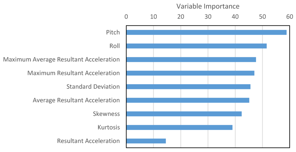The variable importance, calculated by random forest, is shown in Figure 14. It is evident that all features, including orientation readings, are important and add to the predictive power of the algorithm. Resultant acceleration is least important, possibly because all other features are extracted from it and within the extracted features the distinguishable information is magnified. Resultant acceleration can therefore be eliminated from the list of features.