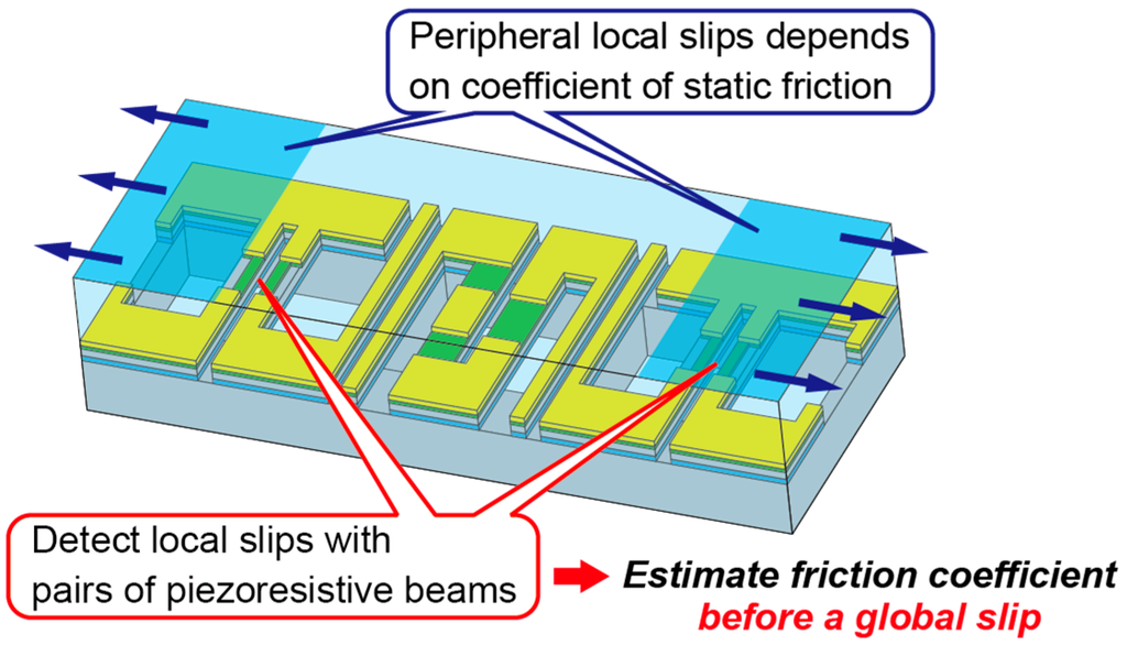 Alternatively, several types of MEMS tactile sensors have been reported [11]. MEMS tactile sensors have several advantages for actual use, for example, miniaturization or multiple functions. Recently, high performance tactile sensors are able to measure not only normal force but also shear force [12,13,14,15]. We have also been developing MEMS multi-axial tactile sensors using flat piezoresistive beams [16,17]. By forming piezoresistors on the surface of a pair of beams, a sensing element that is sensitive to only the vertical deformation of the beams can be achieved. Moreover, by forming piezoresistors on the sidewall of a pair of beams, a sensing element that is sensitive to only the lateral deformation of the beams can be achieved. The crosstalk between the normal force and the shear force is small because of these characteristics. The sensor is also easily miniaturized due to its simple structure. Thus, the developed sensing element is suitable as a tactile sensor. Providing that the function of sensing coefficient of static friction is added to the previous sensor, MEMS sensors will be more beneficial as a tactile sensor.