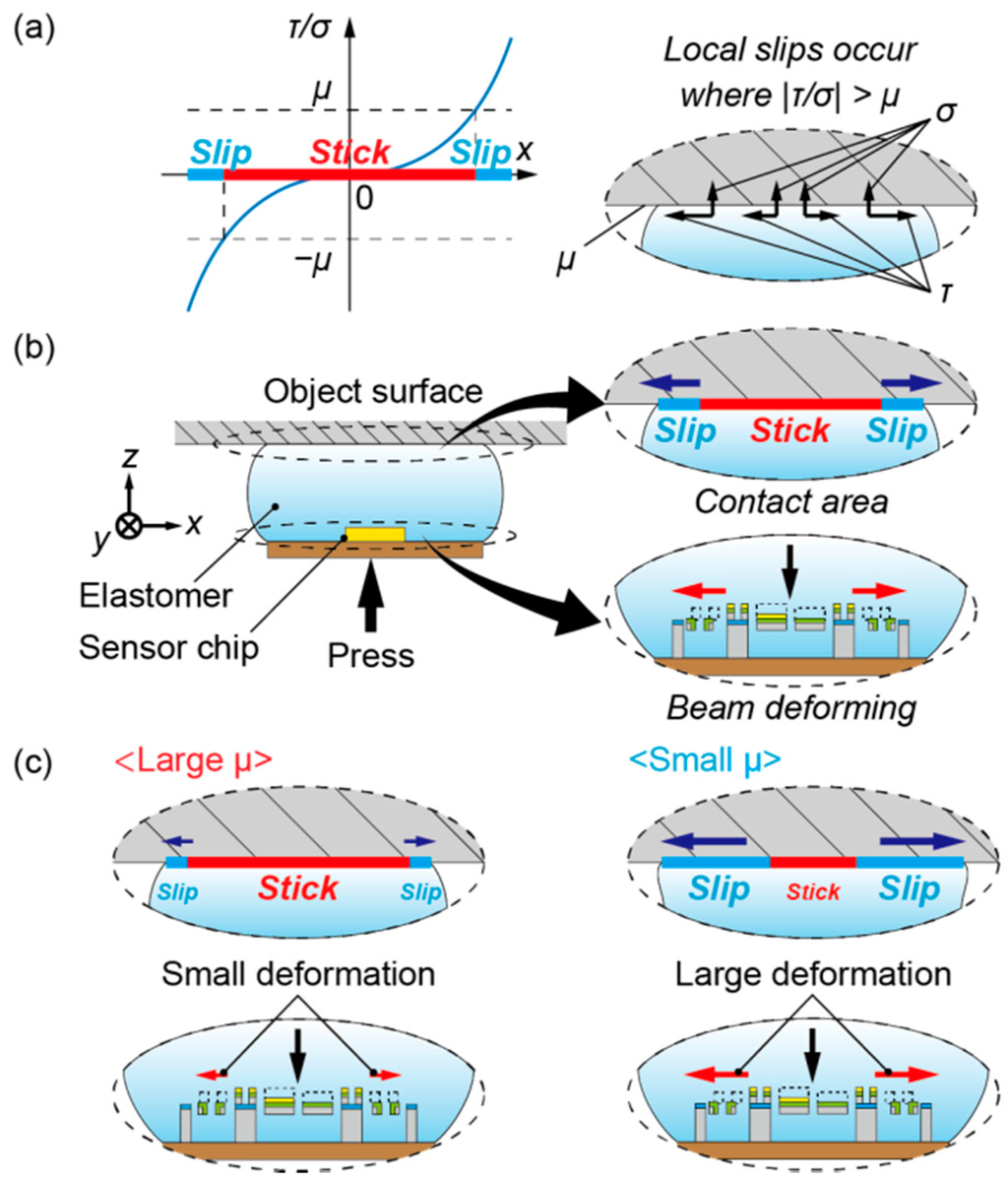 The situation where the proposed sensor is pressed against an object surface is shown in Figure 2b. In this situation, normal and shear stress distributions exist on the contact area, and the slip area exists on the outside whereas the stick area exists on the center, as mentioned above. Alternatively, considering the sensor chip embedded in the elastomer, the beam structure deforms following the deformation of the elastomer. The deformations of the piezoresistive beams can be measured as electric signals using the same method as in a previous report [16]. The beam deformations differ depending on whether the coefficient of static friction is large or small, as shown in Figure 2c. In principle, local slip causes the spread of the contact area. Therefore, the deformation of the elastomer varies according to the proportion of the local slip. The proportion of the local slip is determined by the coefficient of static friction, as mentioned above. Thus, the deformation of each beam also depends on the friction coefficient. On one hand, under a large coefficient of static friction, the slip area is relatively small, and the lateral deformation of the sidewall-doped beams becomes small. On the other hand, under a small coefficient of static friction, the slip area is relatively large, and the lateral deformation of the sidewall-doped beams becomes large. Hence, the difference of the friction coefficient can be detected as the difference between the deformations of the piezoresistive beams.