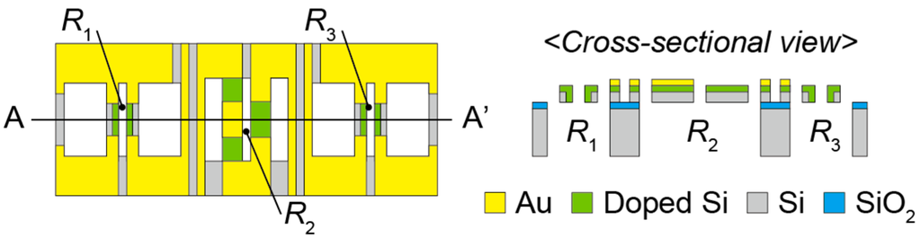 Figure 3 shows the design of the sensor chip. We define three pairs of piezoresistive beams as R1, R2 and R3. These beams are arranged in parallel and fabricated in a 2 mm × 2 mm × 0.3 mm SOI wafer. The length and width of beams of R1 or R3 are 180 μm and 15 μm, respectively. The length and width of beams of R2 are 250 μm and 50 μm, respectively. The thickness of each beam is 20 μm. The gap of two beams of R1 or R3 is 35 μm. The gap of two beams of R2 is 30 μm. The distance between R1 and R2 is 600 μm. The distance between R2 and R3 is also 600 μm. A gold layer is formed as the wiring layer or electrode on a device silicon layer. The edge of each beam of R1 or R3 is covered with the gold layer that can be as long as 40 μm. One of two beams of R2 is covered by a gold layer of up to 65 μm from each edge; the center of the other beam of R2 is covered by a gold layer as long as 120 μm. The dimensions of through hole below R1 or R3 are 180 μm × 400 μm. The dimensions of the through hole below R2 are 250 μm × 250 μm.