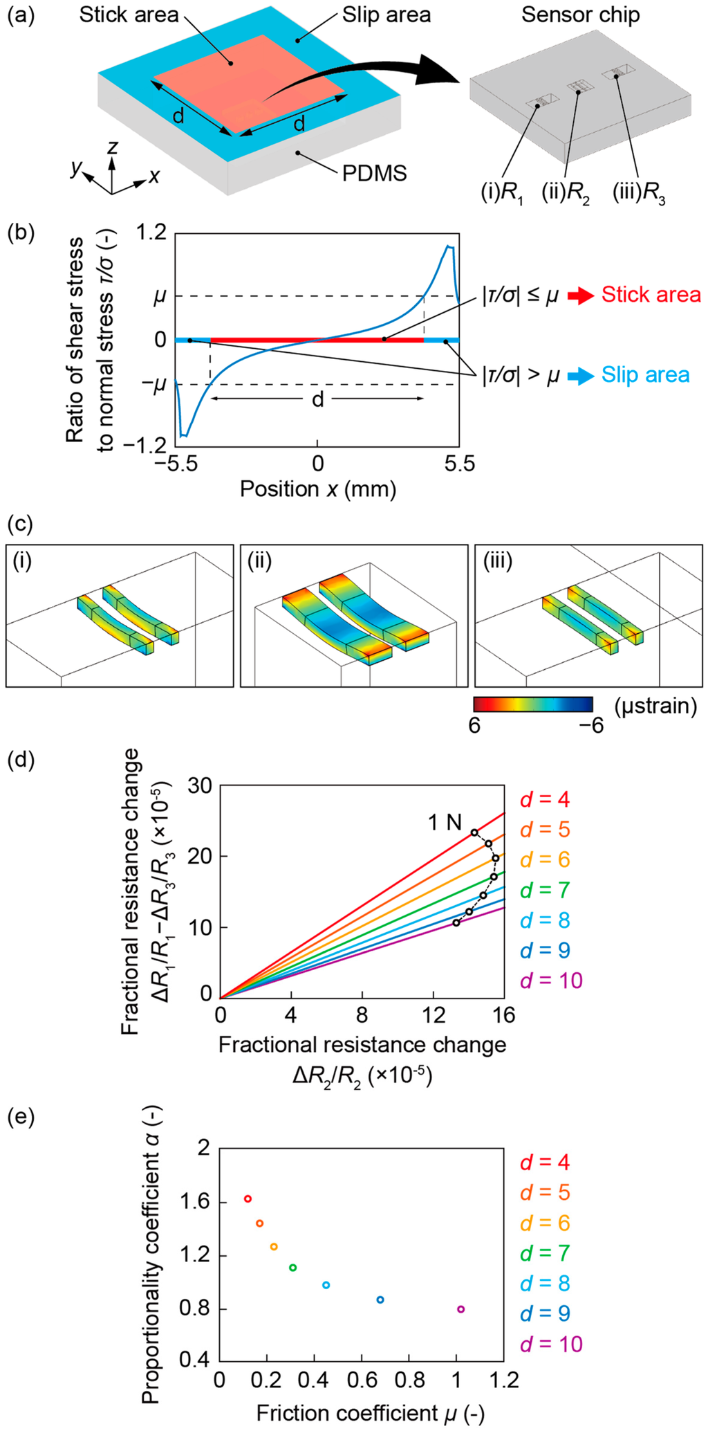 Simulation results. (a) The developed model; (b) Stress distribution on the contact area; (c) Deformation of the beams; (d) Relationship between two fractional resistance changes, ΔR2/R2 and ΔR1/R1—ΔR3/R3; (e) Relationship between the proportional coefficient α and the friction coefficient μ.
