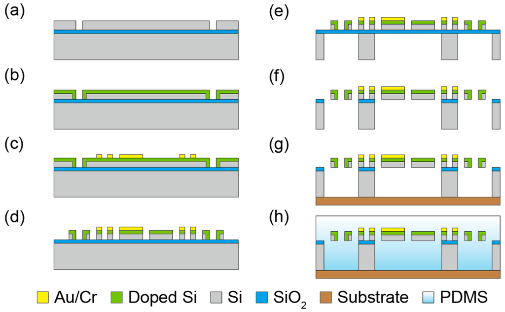 Fabrication process. (a) Etch device Si; (b) Dope P2O5 to the top and side walls of the device Si; (c) Form Au/Cr wirings to the device Si layer with lift off method; (d) Pattern device Si to form beams; (e) Remove handle Si; (f) Remove SiO2 to release beams; (g) Attach fabricated sensor element to flexible wiring substrate; (h) Embed whole structure to PDMS.