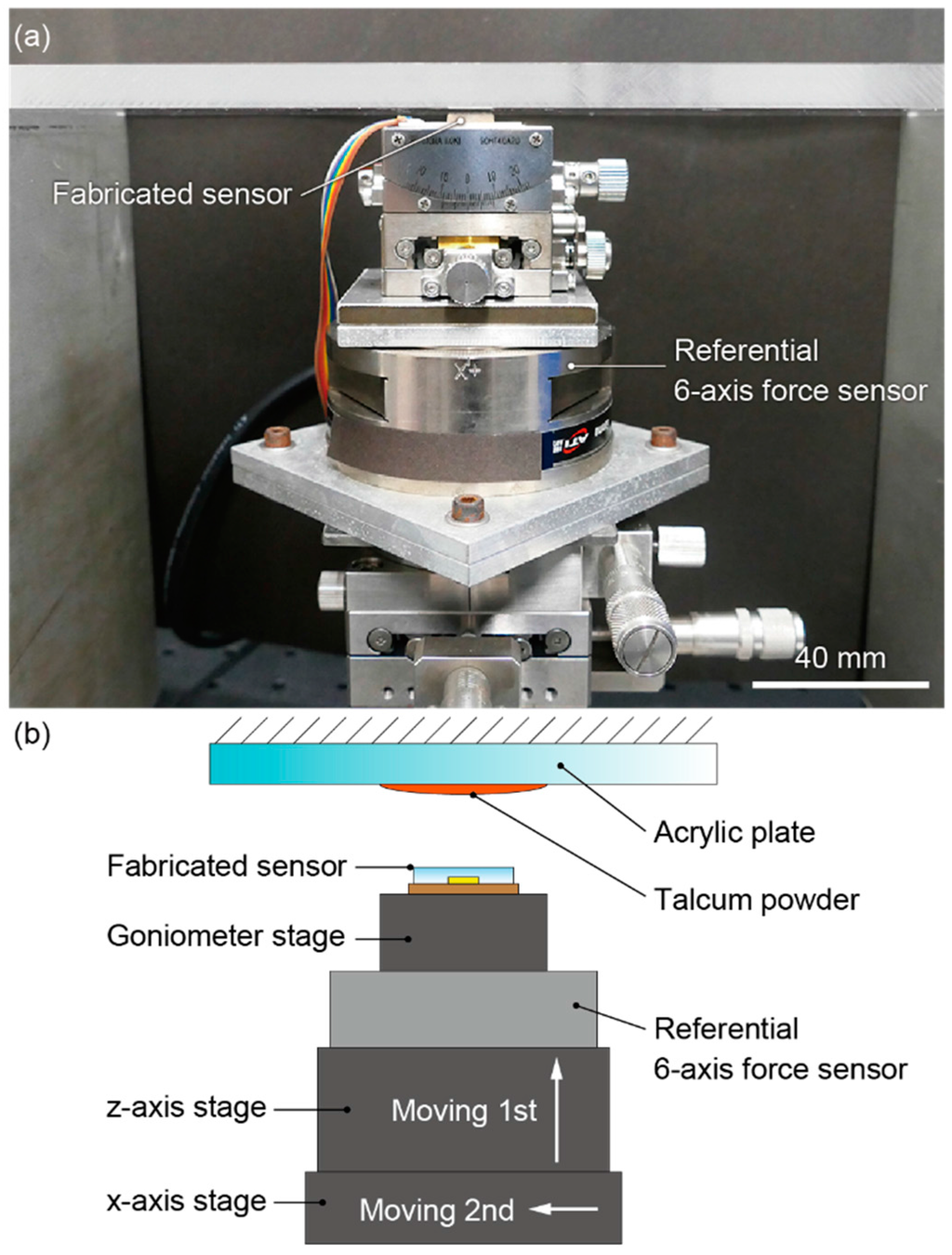 A trial was conducted as follows. First, talcum powder (Baby Powder, Johnson & Johnson, New Brunswick, NJ, USA) was coated on the acrylic plate by wiping it with a cloth. The amount of talcum powder was changed for each trial so that the coefficient of static friction ranged from 0.2 to 1.1. Next, by moving the Z-axis stage, the normal force was applied to the fabricated sensor by pressing it against the acrylic plate, as described in Figure 7b. Last, the shear force was applied by moving the X-axis stage in parallel to the acrylic plate. A global slip occurred when the stage moved by a certain extent. Accordingly, the friction coefficient in this trial was acquired as the ratio of the normal force to the shear force measured by the 6-axis force sensor when the first global slip occurred. After this trial, the acrylic plate was cleaned, and the next trial was conducted. In this experiment, 14 trials were conducted in total.
