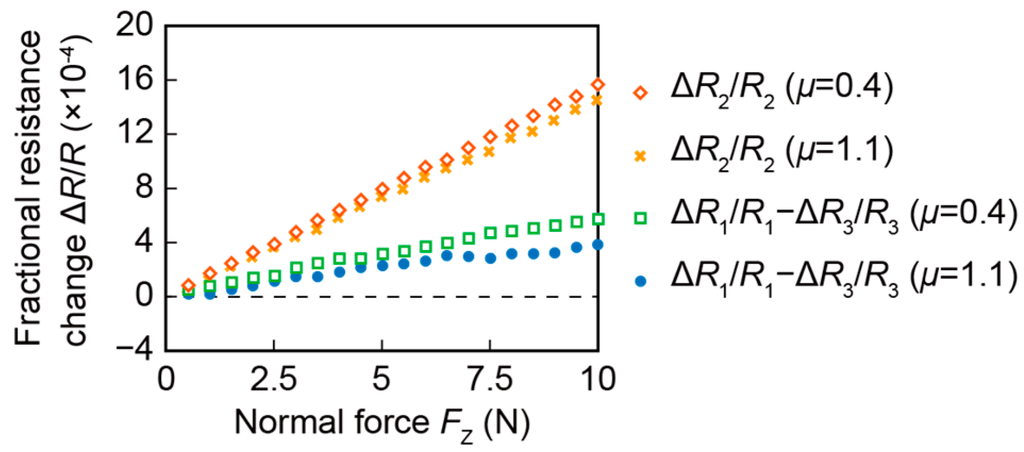 Figure 8 shows the fractional resistance changes, ΔR2/R2 and ΔR1/R1—ΔR3/R3, to the normal force FZ when the coefficient of static friction μ was 0.4 and 1.1. Both ΔR2/R2 and ΔR1/R1—ΔR3/R3 were proportional to the normal force, independent of the differences of coefficients of static friction. The sensitivity was defined as the ratio of fractional resistance change to the normal force. On one hand, the sensitivities of ΔR2/R2 were 1.5 × 10−4 FZ and 1.6 × 10−4 FZ when μ were 0.4 and 1.1, respectively (units for FZ is N). On the other hand, the sensitivities of ΔR1/R1—ΔR3/R3 were 6.1 × 10−5 FZ and 4.2 × 10−5 FZ when μ were 0.4 and 1.1, respectively. This result appears to match the simulation result that the deformations of the beams vary according to the coefficient of static friction. Moreover, the sensitivity of ΔR2/R2 was approximately equal to that acquired in the simulation. However, the sensitivity of ΔR1/R1—ΔR3/R3 is equal to half of the simulation result. The reason for this is thought to be that the sidewall-doped beams had extra parallel piezoresistors on the surface, as mentioned in the previous report [16].