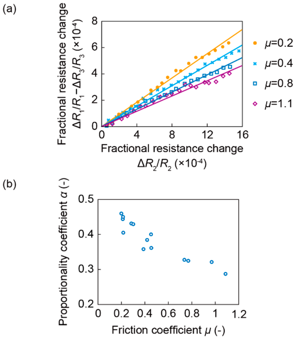 Figure 9b shows the relationship between μ obtained in each trial and α plotted for all of 14 trials. It was confirmed that α increased while μ decreased, in agreement with the simulation result. Therefore, using this relationship, μ was able to be estimated from α. The value of α calculated in the experiment was approximately half of that of the simulation because the sensitivity of ΔR1/R1 – ΔR3/R3 is half of that of the simulation, as mentioned above.