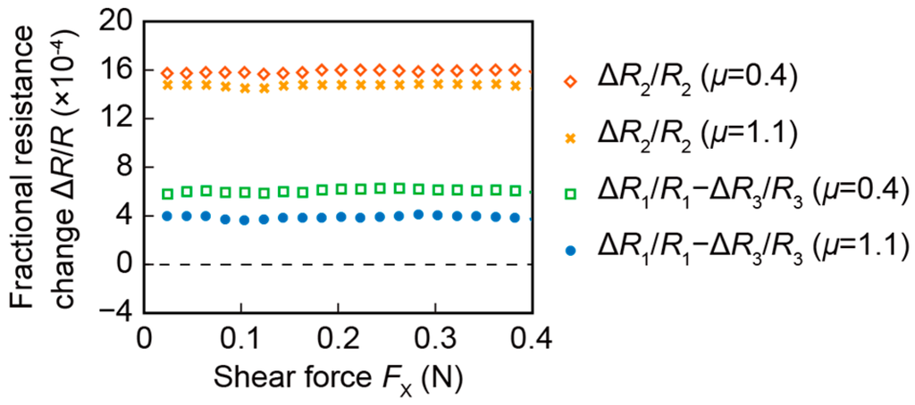 Figure 10 shows the fractional resistance changes, ΔR2/R2 and ΔR1/R1—ΔR3/R3, to the shear force FX with the coefficient of static friction μ of 0.4 or 1.1. After applying a normal force, the shear force was gradually applied. Both ΔR2/R2 and ΔR1/R1—ΔR3/R3 were kept constant against the shear force; these values did not change from the initial values with the normal force. In actual use, some unintentional shear force is possibly applied on the sensor surface. As a result, the robustness against shear force is required for the estimation of the coefficient of static friction. The experimental result shows that the proposed sensor was robust against shear force.
