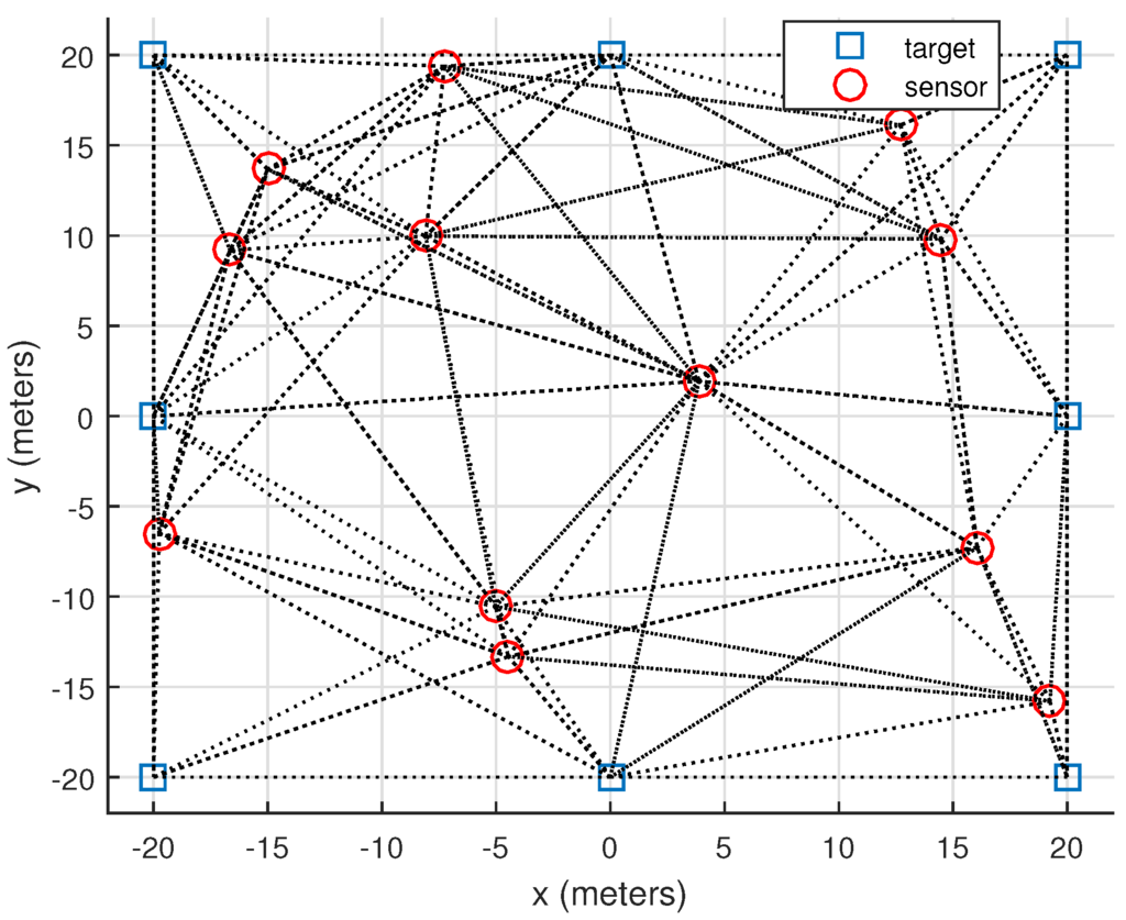 In this section, the effectiveness of the proposed localization approach based on the modified Newton’s method is numerically investigated. Moreover, its location estimator is employed and compared. We consider a WSN consisting of 20 nodes placed in an area m with 8 of them are anchors and its geometry is illustrated in Figure 2, i.e., and . The anchor locations are (20,20), (−20, −20), (20, 0), (−20, 0), (20, −20), (20, −20), (0, 20), (0, −20). The unknown sensor locations are randomly placed in this area. The maximum communication range between the nodes is set to be 25 meters. For the parameters in the path loss model of Equation (10), dB, meter and for . We define the root mean square error (RMSE) by