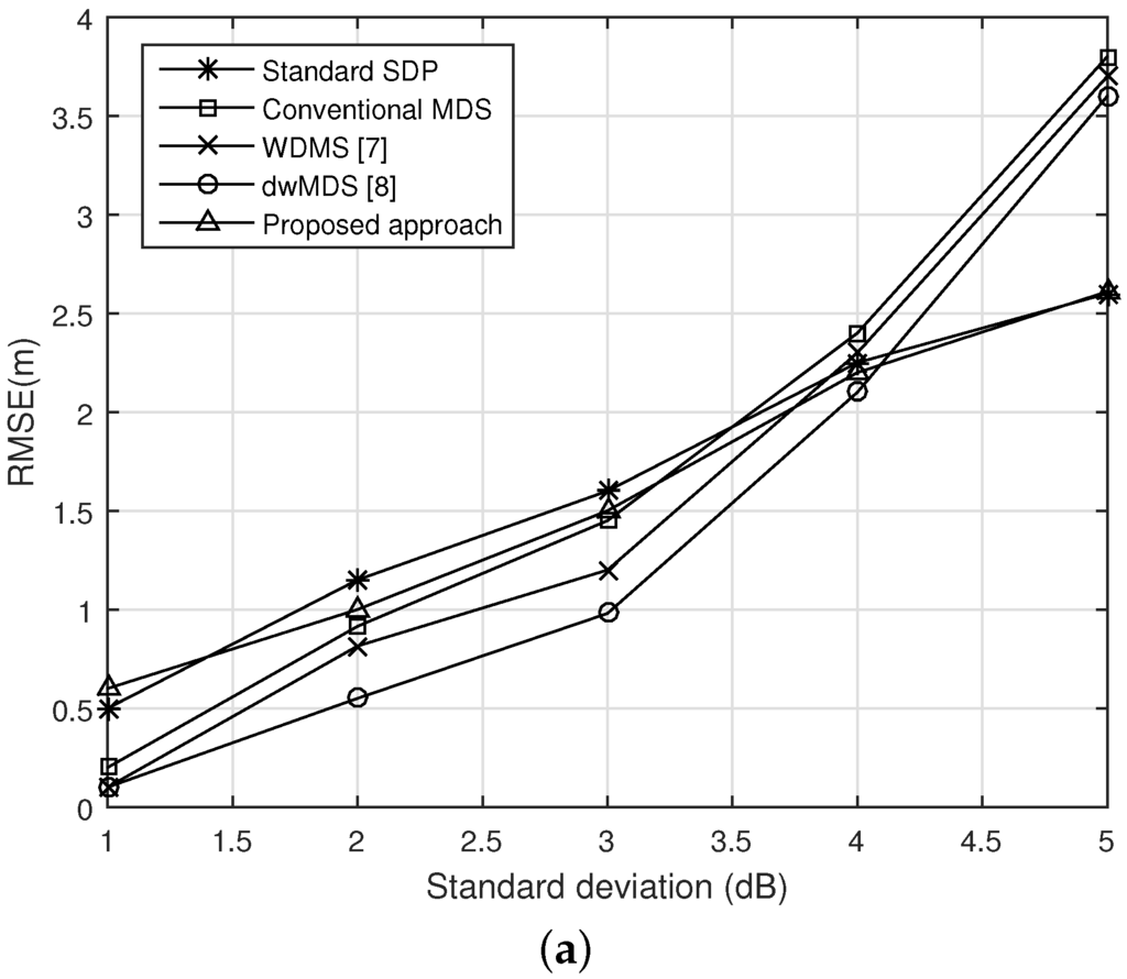 In order to solve Equation (7), several approaches have been studied in [4,5,6,7,8,9]. The conventional MDS method transforms the pairwise distance information into the relative coordinates of sensor nodes [4,5,6]. Thus, the global solution only obtained when we use all pairwise distance measurements of sensors, which is impractical. To overcome this problem, the authors in [7,8] proposed the distributed weighted MDS (WMDS/dwMDS) method, while the authors in [9] proposed the MDS-MAP. Both methods are basically based on either the linearized least square estimator for TOA information or the biased RSS-based estimators, so that the estimated solutions can be obtained explicit and much easier than the conventional MDS. However, their accuracy is not good when the variance of the measurement noise is large.