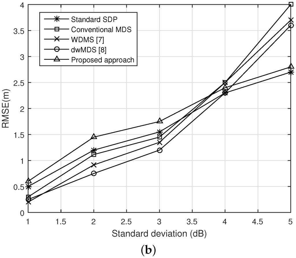 For the purpose of comparison, the RMSEs of our scheme and several schemes versus σ are shown in Figure 4. Each result is collected after 1000 independent runs. After obtaining the distance information in Equation (12), we get the standard SDP estimator (SDP is used in the context of linear matrix inequalities and can be efficiently solved by interior point methods, which has the complexity of ), here, ϵ is a given solution precision) by using the CVX package [18,19]. From the figure, we observe that our solution achieve the solution that better than the conventional MDS, WMDS, and dwMDS methods when the noise is large, and quite comparable estimation accuracy with the standard SDP for a small value of σ, since our solution depends on how good initial points are. It can be improved if we can choose a good parameter to set up. Figure 4b give us such an example. However, note that in this particular simulation with MATLAB implementation, the proposed method is faster than the others in running time.