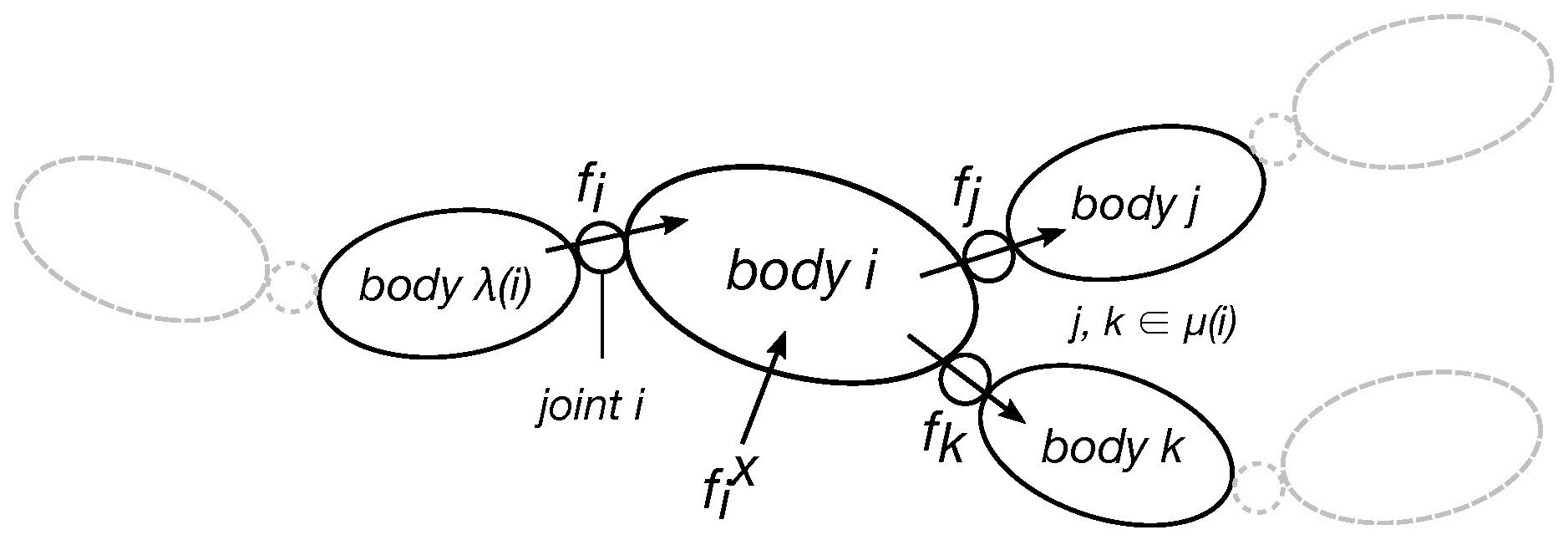 - force transmitted from to body i;