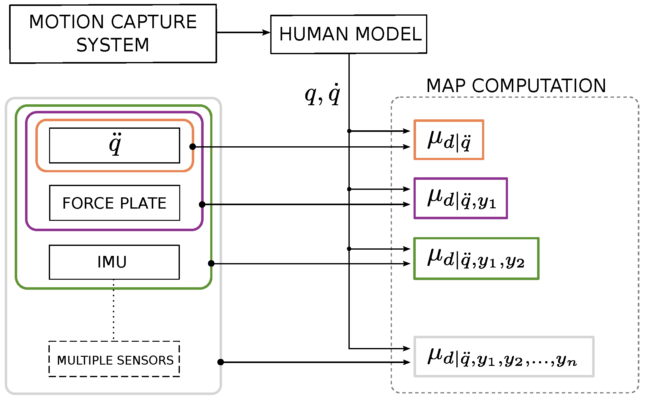 General scheme of the experimental set-up including a motion capture system and a block of sensors. Data coming from the motion system were used as inputs for each Maximum-a-Posteriori (MAP) computation and, progressively, sensor measurements (, force plate sensing and inertial sensor IMU) were added to compute a more complete version of MAP. Although only three sensors are used (the ‘multiple sensors’ block is not present in this version of experiment), in general, the set-up can embed n sensors and exploit their measurements to enhance the dynamic estimation of d.