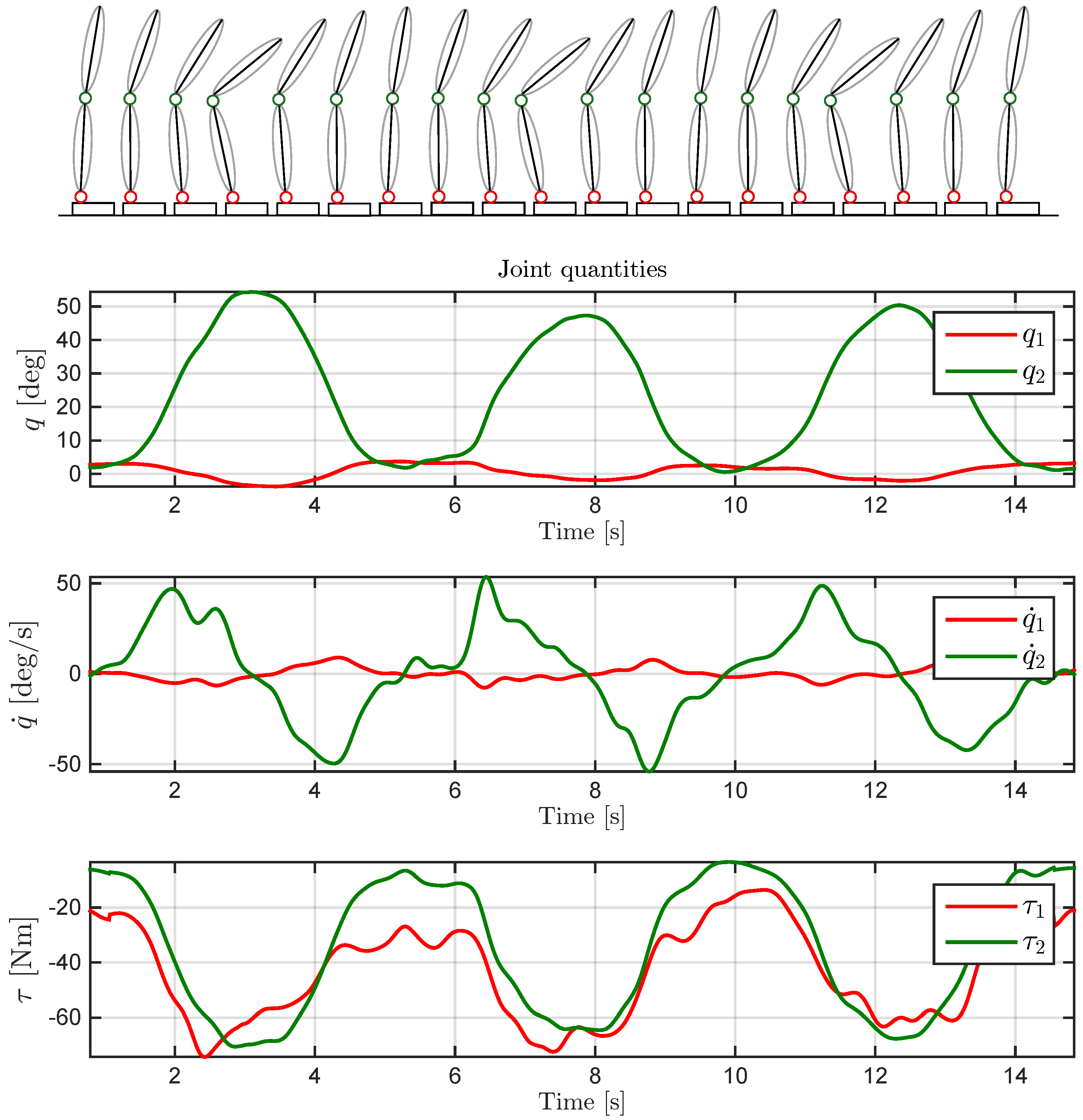 Representation of a trial composed of three repetitive bows (on top). Joint quantities: angles and have been obtained from motion capture acquisition with a frequency filtering; velocities and have been computed using a third-order polynomial Savitzky–Golay filtering; torques have been computed using MAP estimation exploiting all sensors involved in the analysis (on bottom).