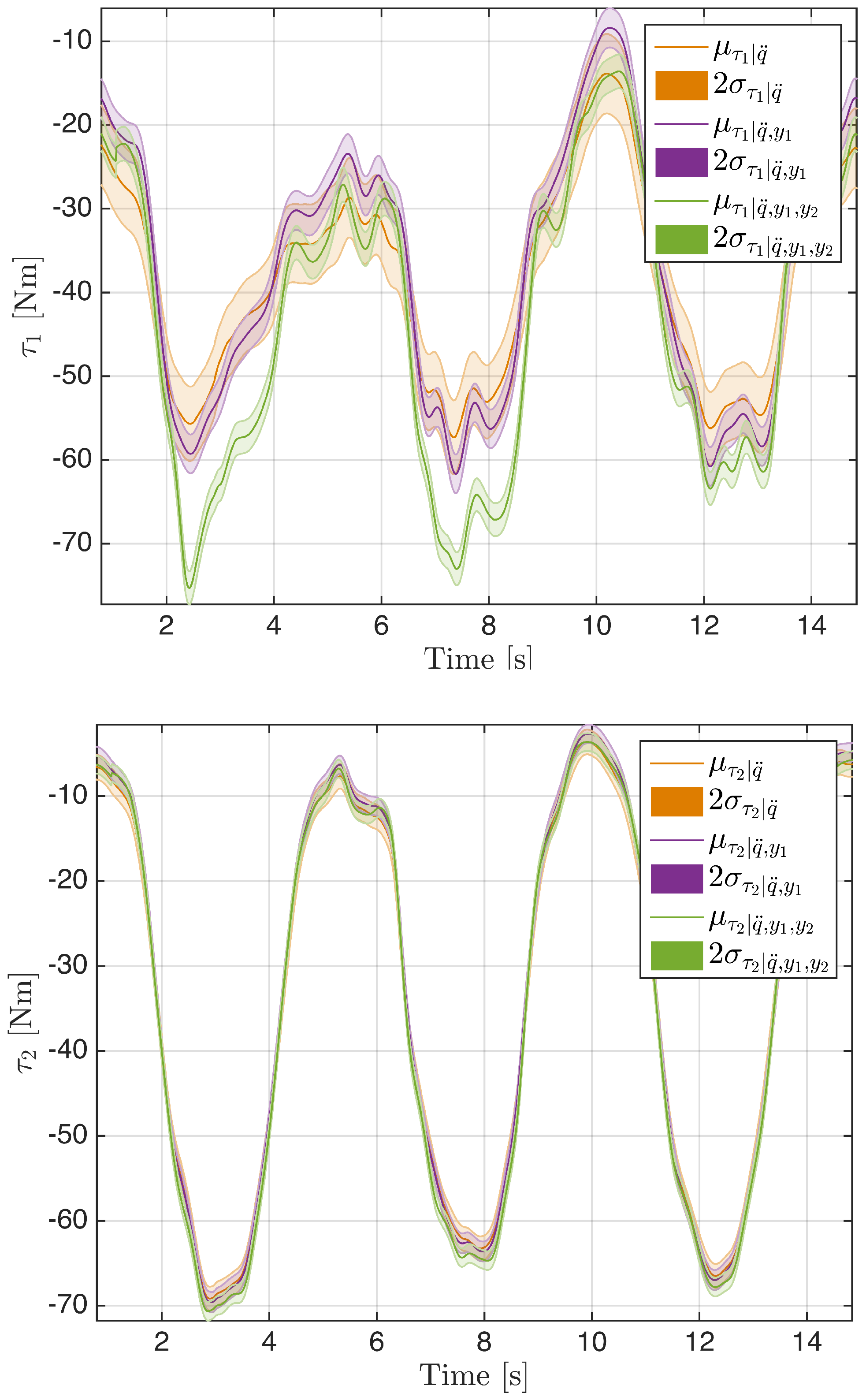 There are two reasons for preferring Equation (4) to alternative formulations such as the Euler–Lagrange equation. On the one hand, Equation (4) can be used to represent uncertainties that capture relevant modeling approximations (see also Section 3.4). In particular, approximations result from the fact that human bones coupling is neither rigid nor purely rotational and these can be captured with additive noise Equation (9) on Equation (2). More accurate models would be possible [14], but Equation (9) would still capture approximations on bone couplings, which are often relevant and meaningful. On the other hand, there are numerical advantages associated to Equation (4). In the case of inverse and forward dynamics, the numerical advantages are exactly those obtained by algorithms like the RNEA and the ABA (Articulated-Body Algorithm) presented in [11] and whose relations to Equation (4) is discussed in [10].