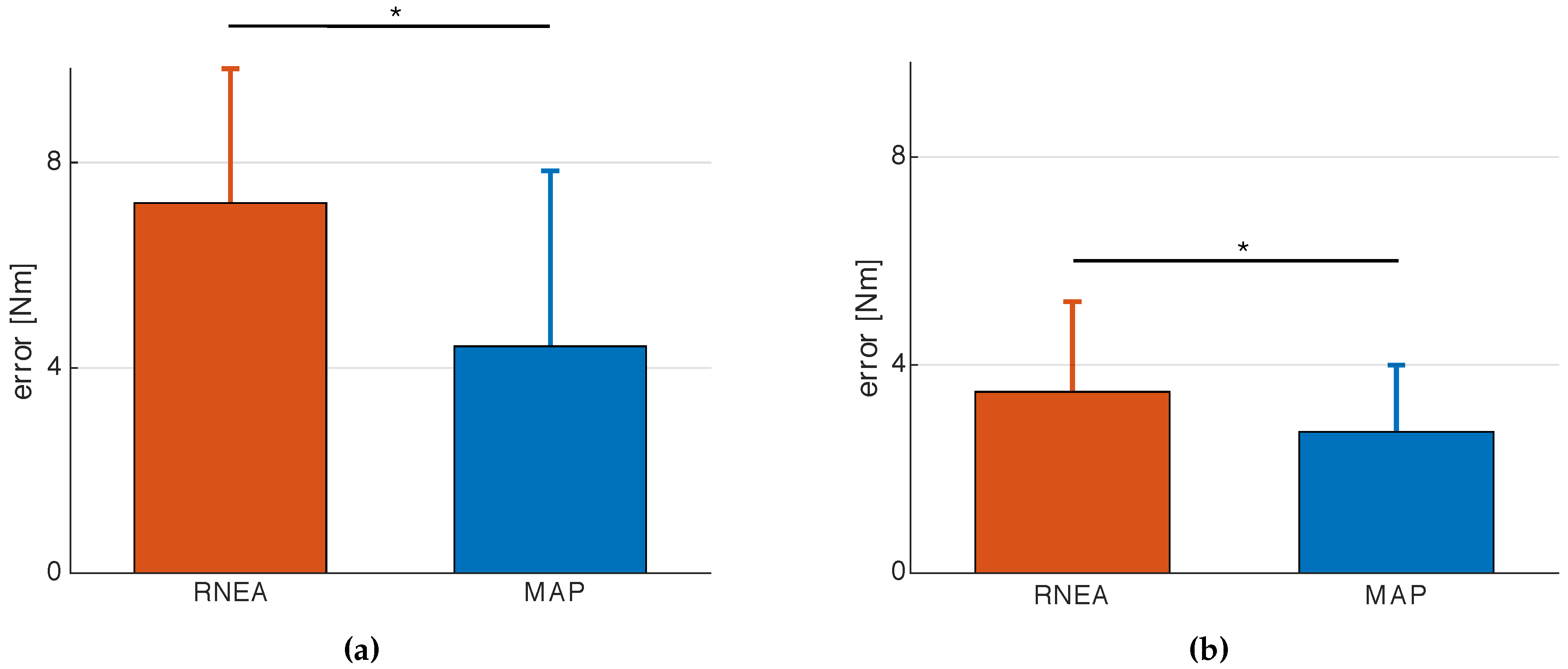 Error on torque estimation comparing RNEA and MAP methods on (a) and (b), (* p-value < 0.05).