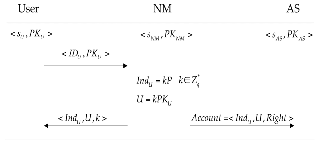 Each user must execute this stage (shown as Figure 2) before accessing the services. The user sends his identity and public key to the network manager, and the network manager chooses randomly, then computes a user index and for the user, the network manager simultaneously issues to the user and to the server. Here, indicates auxiliary information such as service type and prescriptive period. This phase should be carried out under the security channel. We believe that NM is reliable, which is a prerequisite and the basis of trust. So the k will not be leaked to others.