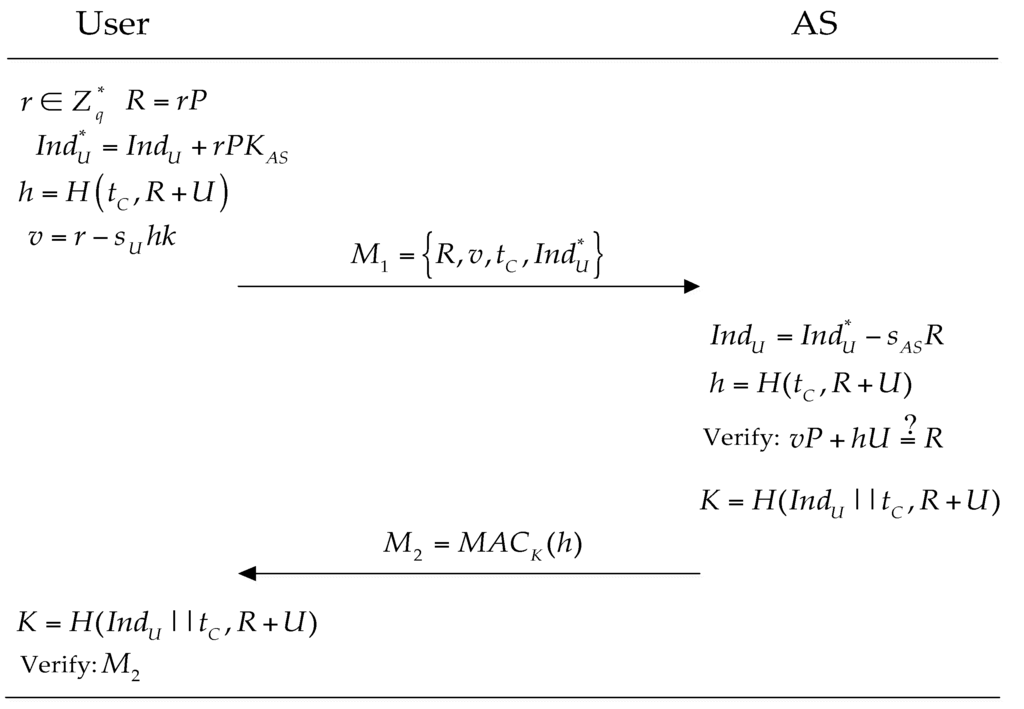 System is set up by NM, generating keys and establishing an enrollment system. In this step, NM determines its public/private key pair , where , and publicizes the system parameters , in which represents the security parameters. We suppose that AS also has a long-term key pair , where . Each user generates a pair of public or private key , here . and are a cyclic additive group and cyclic multiplicative group of the same prime order , H is a secure hash function, .