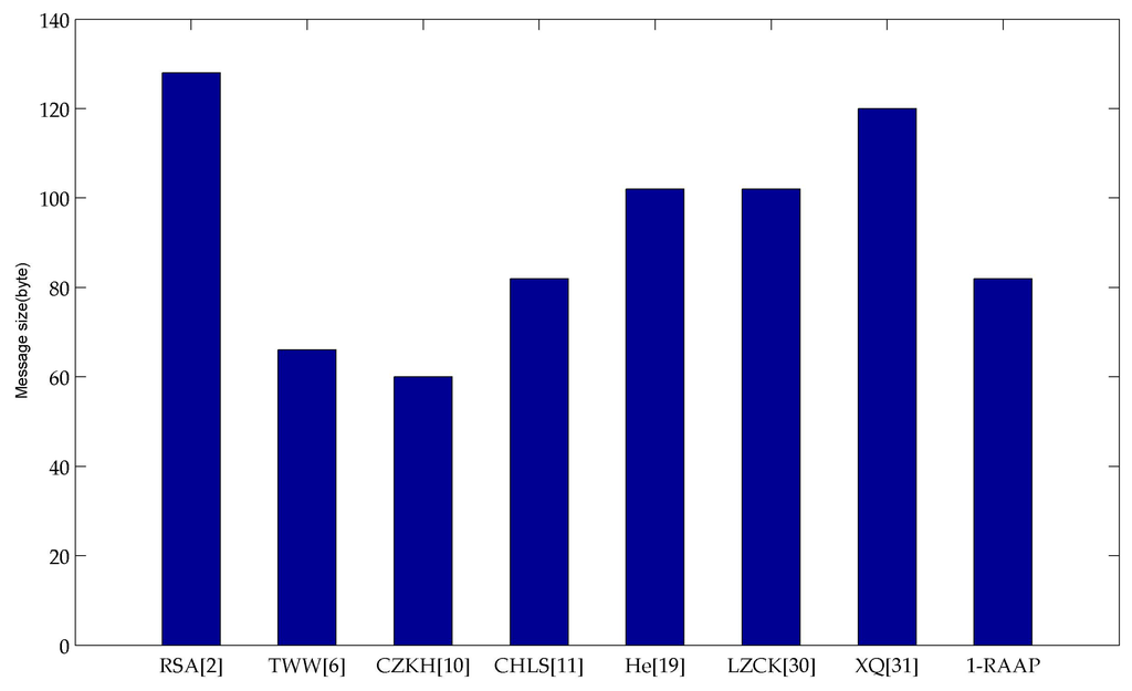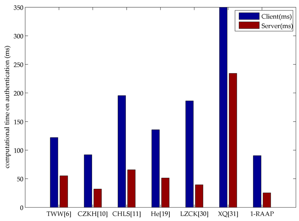 By comparing with the other schemes in different phases, it is clear that our scheme performs better. We note that the server takes the most time in 1-RAAP, but what cannot be neglected is the phenomenon that the server terminal spends most time on the initialization phase that will only run once at the beginning of the system’s setup, 1-RAAP costs the least in total authentication process time after being initialized. It is obviously more efficient than others. It proves that 1-RAAP successfully transfers the calculation burden to the server whose computing ability is relatively stronger. Also, it saves the energy consumption in the user terminal. These merits make 1-RAAP very suitable in the WBAN scenario.
