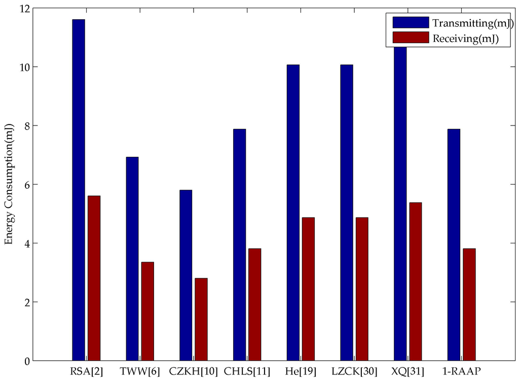 - Revocable and Scalable Certificateless Remote Anonymity Authentication scheme in [31]: The message size of this scheme is 188 bytes. The energy overhead can be calculated as follows: