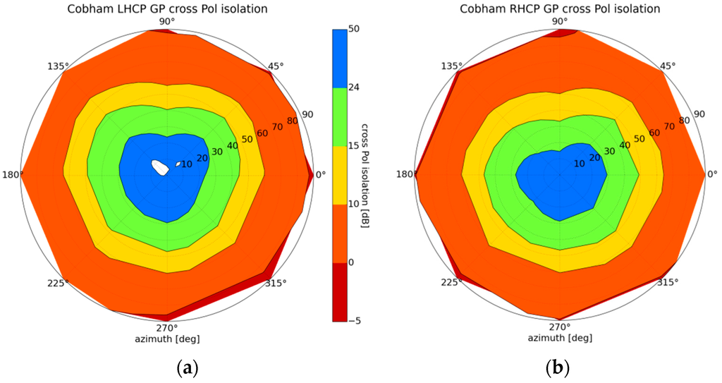 Nadir-looking antenna (Cobham DS1563) cross-polarization isolation: (a) LHCP Port; (b) RHCP Port. The radial scale is the incidence angle. Measurements performed at the Centre National d’Etudes Spatiales (CNES), Toulouse France.