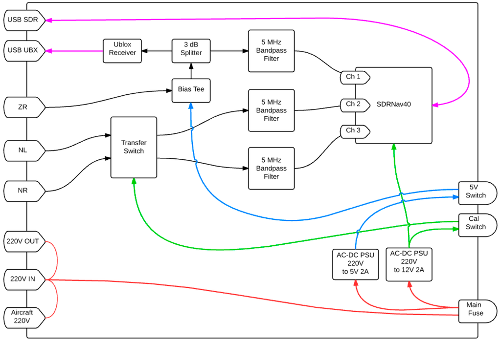 GLORI Front End. Black: RF signal; Red: 220 V, 50 Hz power supply; Blue: 5 V Power supply; Green: 12 V Power supply; Purple: USB Serial Data Link.