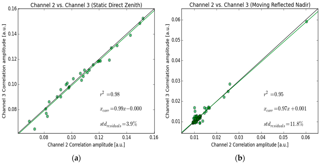 Figure 4a shows the results of the polarimetric calibration (between Channels 2 and 3) for the entire campaign. The correlation between different pairs of channels is found to be very good (coefficient of determination r2 = 0.98), with a calibration factor of 0.99 (almost identical power in each channel). The standard deviation of the calibration data residuals, which is likely to be the consequence of apparent movements of the GNSS satellites with respect to the antenna’s radiation diagram, is of the order of 4%, leading to an inter-channel calibration error of approximately 0.35 dB.