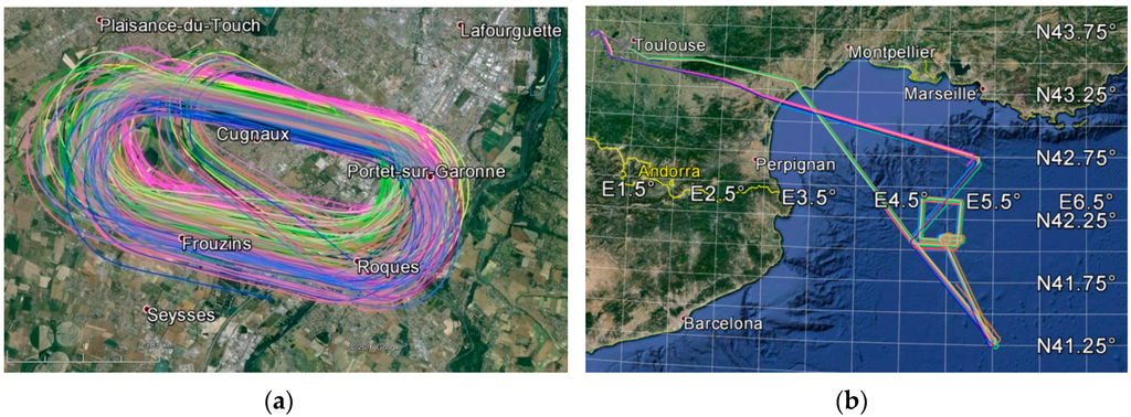 Racetrack flight over Francazal Airport (a) and Test Flight over the Gulf of Lion (b). The coloured lines represent distinct satellite reflection tracks (GLORI 2014 Campaign).