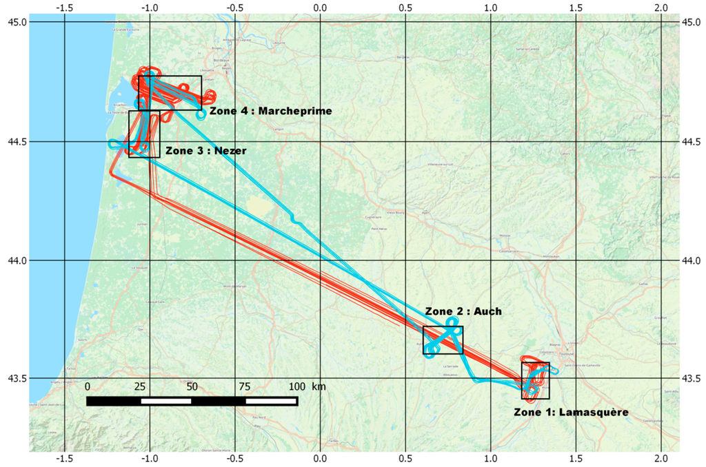 Location of the GLORI 2015 Test Sites in Southwest France. The blue lines show an example of reflection tracks from a Type A (short) flight, whereas the red lines correspond to a typical Type B (long) flight.