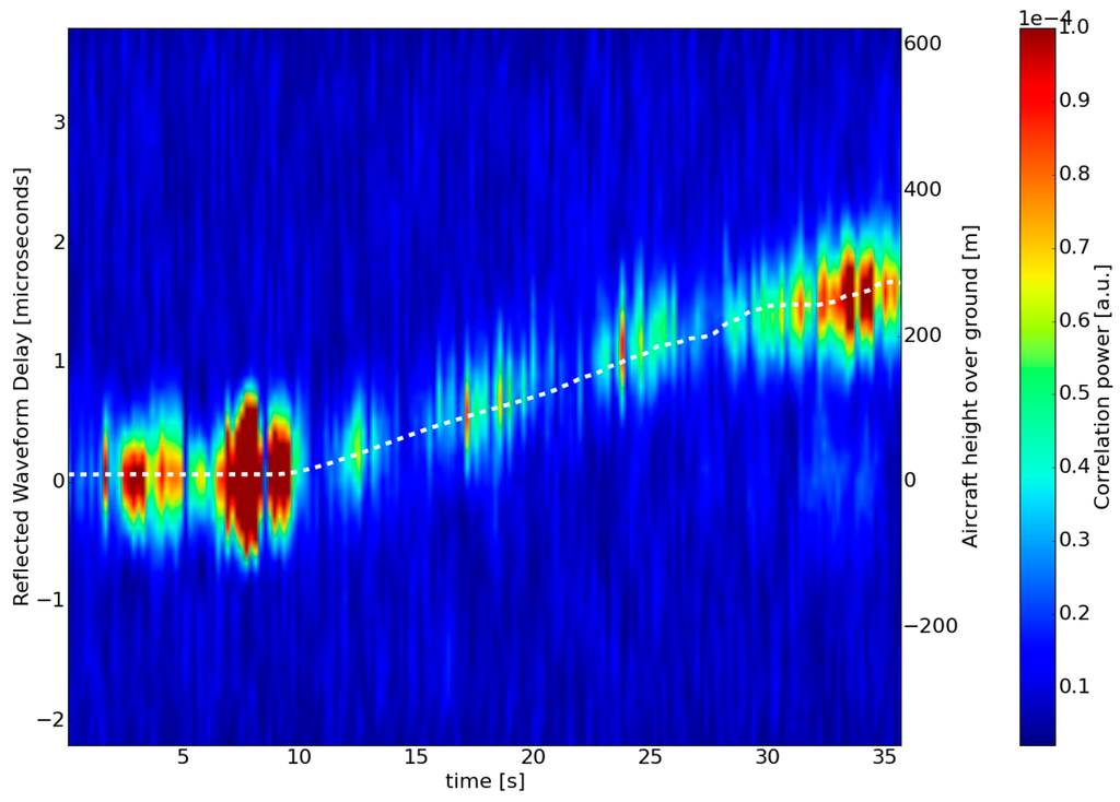 Variation of reflected correlation waveforms Yr (arbitrary units) vs. time during the take-off sequence (29 June 2015, 5:33:41 UTC, PRN13, incoherent integration time 200 ms). The aircraft’s height above ground, provided by the radio altimeter, is shown by the white dashed line.
