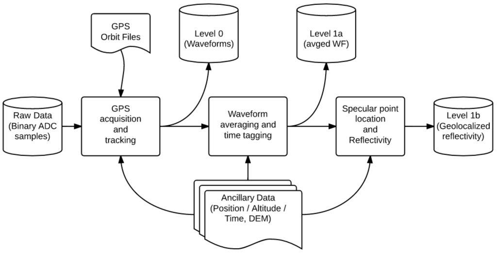 - For each flight, the data are then aggregated, including ancillary and calibration information. During this step, the apparent reflectivity is calculated, as well as the location and shape of each specular ellipse corresponding to the first Fresnel zone [45] from the ancillary data and precise time tagging of the ICFs.