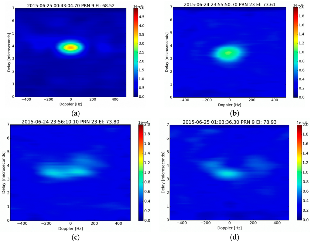Figure 9 provides four examples of DDMs generated over different types of surface, from an altitude of approximately 600 m, with a coherent integration time set to 5 ms and an incoherent averaging time set to 200 ms. Figure 9a shows the DDM generated from a pond flyover. It can be seen that all of the reflected energy is concentrated in the zero Doppler bin, showing strong signal coherency, as could be expected from a reflective surface such as calm water. Figure 9b shows the DDM produced over a recently planted carrot field, with very little vegetation cover. It can be seen that the energy reflected by the surface is also concentrated in the zero-Doppler bin, thus showing that it produces a strongly coherent reflection, although the reflected energy is 10 times weaker than that measured over water. Figure 9c shows the DDM produced over a mature corn field. It seems that most of the reflected energy also originates from a limited Delay-Doppler area, even if a spread in the Doppler range seems to indicate a somehow stronger incoherent scattering contribution, which is probably caused by reflected signal interactions within the vegetation layer. Finally, Figure 9d shows the DDM produced over a 15 year-old pine forest, in which a part of the reflected energy also seems to be spread over several Doppler bins. It is likely this result is also related to incoherent scattering of the reflected signals from the forest canopy.