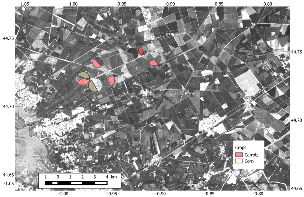In this section, we study the influence of two different kinds of agricultural crops on the apparent surface reflectivity and on the circular polarisation ratio of the reflected signals. We analysed two main types of crops: (i) recently planted carrot fields, which can be considered as equivalent to bare soil fields since the carrot plants are small and do not completely cover the ground, with a measured height ranging from ~0 to 25 cm; and (ii) more mature corn crops with an higher cover fraction, and a plant height varying between 50 and 150 cm. In both cases the field soil moisture was relatively stable (estimated with theta probes as ranging from 0.1 to 0.15 m3/m3). The location of the plots can be seen in Figure 10.