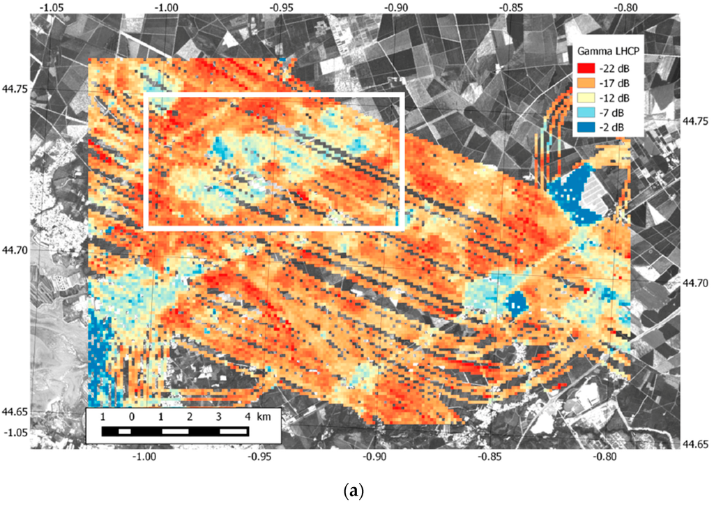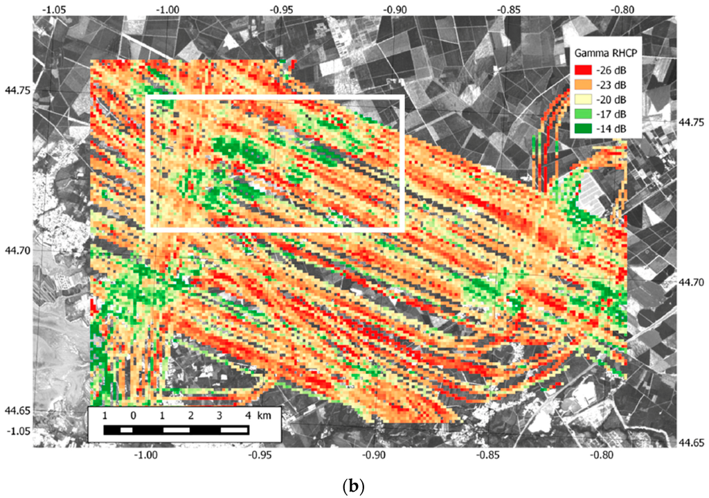 Figure 11a shows the reflectivities measured using LHCP polarization. The dynamic range (~20 DB) of the recorded signals (from −22 to −2 dB) is represented here by the coloured pixels. The main features of this area are clearly visible: roads, urban areas, water, a solar power plant, pine stands and an agricultural area. In the agricultural area (white rectangle), the bare soil fields have a stronger reflectivity signature than the zones covered by vegetation. The weakest reflectivity signatures can be observed for the closed-canopy forest. One remarkable feature of the LHCP measurements is the homogeneity of the recorded signals, despite the use of measurements taken from a wide range of elevation angles: as predicted by the models, the LHCP signal is only weakly dependent on elevation angle, when this latter is greater than 45° [30].