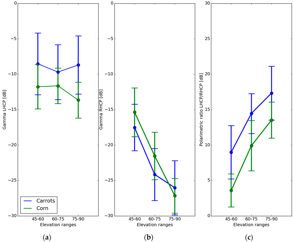 Average apparent reflectivity and polarimetric ratio for 2 classes of crops (recently planted carrots, considered to be equivalent to bare fields, and mature corn), and 3 classes of elevation (45°–60°, 60°–75° and 75°–90°). (a) apparent LHCP reflectivity; (b) apparent RHCP reflectivity; (c) LHCP/RHCP polarisation ratio. Vertical error bars represent the 1-sigma standard deviation.