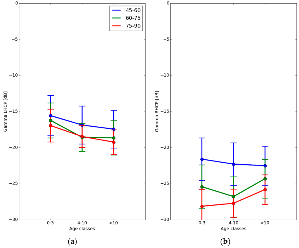 Figure 13 shows the average value of the apparent LHCP and RHCP reflectivities, for three elevation angle ranges (45°–60°, 60°–75°, 75°–90°), and for three classes of forest age: very young (0–3 years), medium (4–10 years) and closed canopy (>10 years).