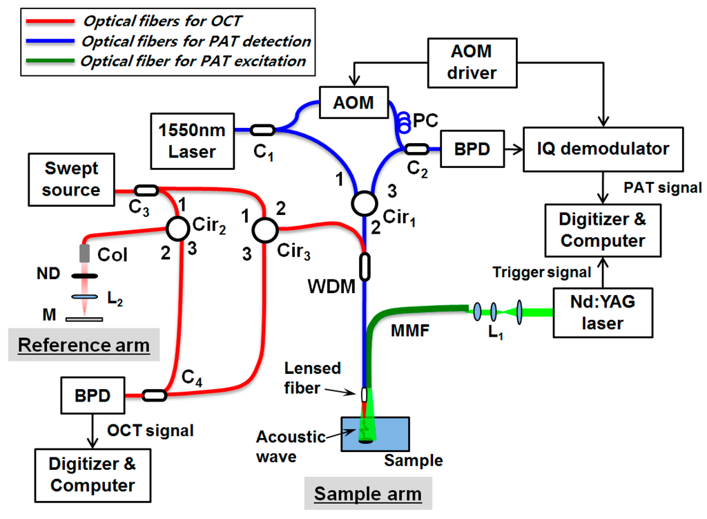 The proposed all-fiber-based combined PAT-OCT system is depicted in Figure 1. The system configuration is based on two fiber-based Mach-Zender interferometers; one for the noncontact PAT system (blue lines) and the other for the OCT system (red lines). The common fiber-optic probe, made up of a lensed single-mode fiber (SMF) and a large-core multimode fiber (MMF), is used for the common sample arm of two systems.