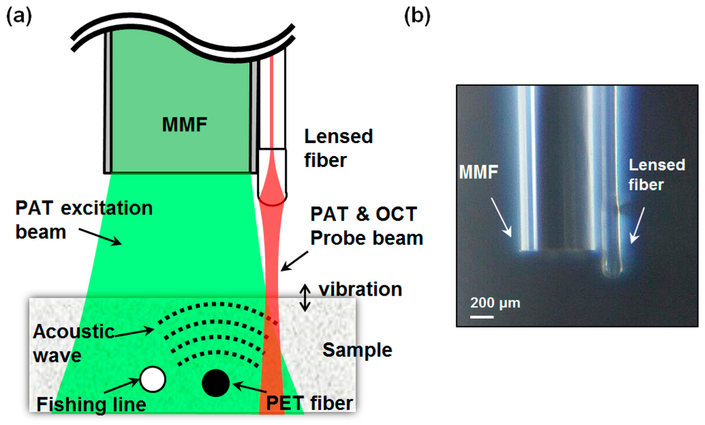 (a) Schematic and (b) photograph of the all-fiber microsized probe. It is composed of a lensed single-mode fiber (SMF) for optical coherence tomography (OCT) and photoacoustic tomography (PAT) interrogation, and a multimode fiber (MMF) for PA excitation.