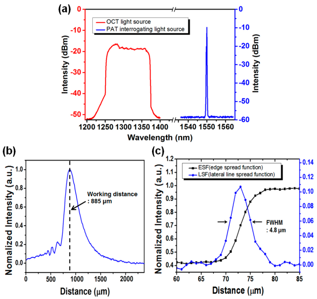 (a) The wavelength spectrum of the combined beam of OCT and PAT after passing wavelength division multiplexer (WDM); (b) The recoupling optical power of the light beam back reflected from a mirror moving away from the lens tip, plotted in terms of the mirror distance from the tip; (c) Edge spread function (ESF) obtained from a knife-edge mirror (square-symbol black line) and line spread function (LSF) obtained by taking the derivative of ESF (round-symbol blue line).