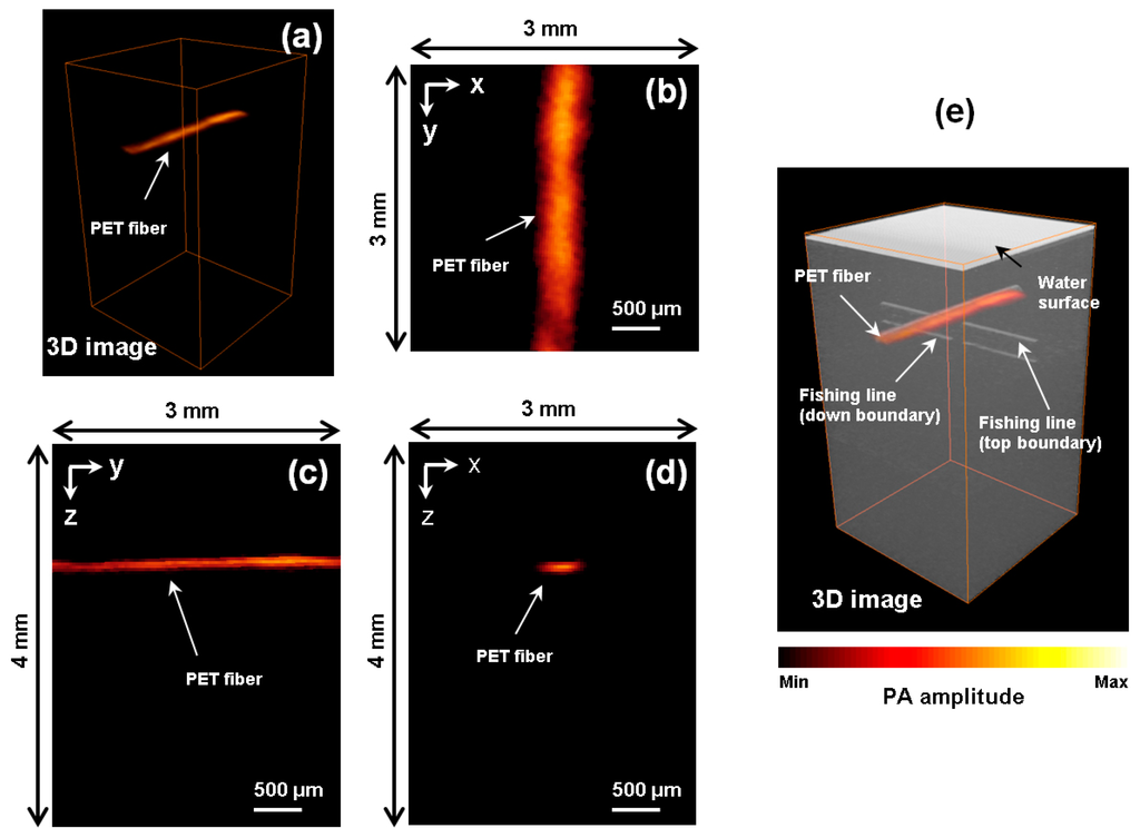 Secondly, the reconstructed PA images acquired simultaneously with the OCT images are shown with Figure 5. Figure 5a shows the acquired 3D PA image of the phantom. In contrast with OCT, only the black PET fiber appears clearly. The transparent fishing line, which has low absorption at the wavelength of the pulsed laser, is invisible in the PA image. The cross-sectioned PA images in the xy, yz, and xz planes are reconstructed in Figure 5b–d, respectively. The PET fiber is clearly recognized in all directions and well matched with the actual location of the PET fiber in the phantom.