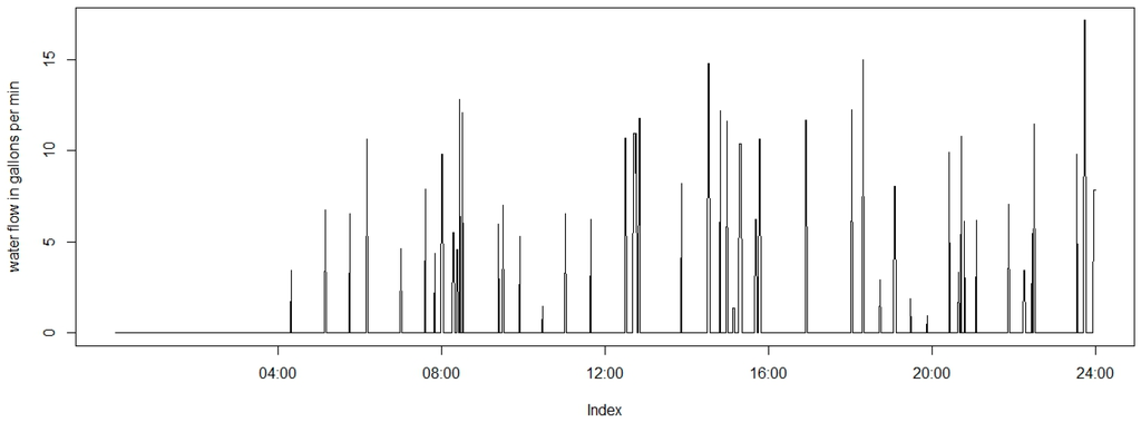 36], as they can be fitted outside of the premises of a customer and are, thus, the least intrusive instrumentation option from an occupier’s perspective. They directly measure the volume of utilised water usage activities, which forms the basis of customer billing. Approaches based on flow meters require relatively low sampling rates, e.g., one sample every 5 s.