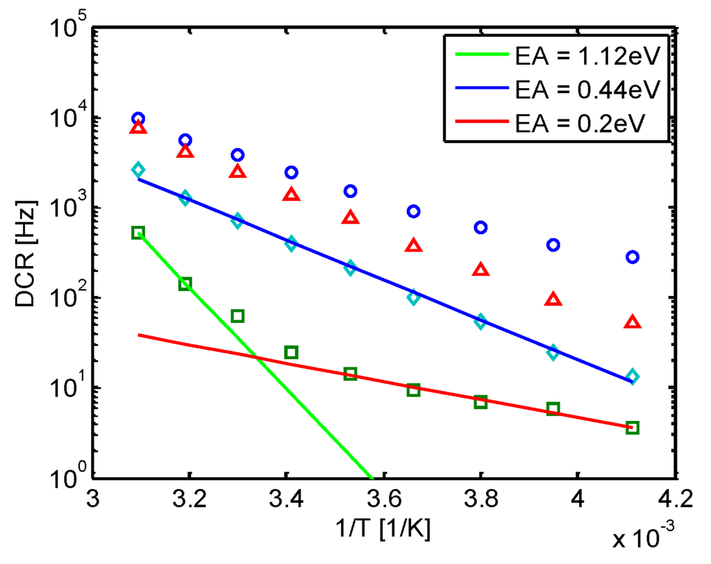 Some insight on the origin of DCR can be obtained by analyzing its temperature dependence. Figure 3 shows the DCR temperature dependence of four devices with the same area, representative of the behavior of a whole distribution. The three SPADs with high DCR have an activation energy lower than EG/2, indicating the presence of trap-assisted tunneling. For the SPAD with low DCR, the activation energy has a transition between EG and 0.2 V as the temperature decreases. In this device, DCR is dominated by injection of minority carriers from the neutral regions at high temperatures, and from tunneling at low temperatures. The relative weight between the different components determine the shape of the DCR distribution. If the devices are small and the amount of contaminants is low, DCR will mostly be dominated by minority carrier injection or band-to-band tunneling, and will be very uniform. If, on the contrary, the amount of contaminants is relatively high, the distribution will not show a plateau.