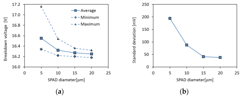 Measured breakdown voltage as a function of SPAD diameter. Measurements were done on 150-nm CMOS SPADs [27]. (a) Breakdown voltage distribution; (b) breakdown voltage non-uniformity (standard deviation).