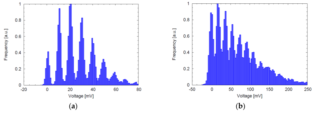 As a first comparison, the analog photon counting may be addressed: by selecting a single pixel and recording the output analog values, it is possible to reconstruct an histogram showing the characteristic peaks corresponding to the detection of 0, 1, 2, …, photons. As shown in Figure 10, both histograms show clearly the single photon detection resolution, but Figure 10a highlights a better noise performance with almost isolated peaks. The higher noise visible in Figure 10b is due to the smaller in-pixel capacitance values used for the analog counting, leading to larger kTC noise contribution. In both cases, the kTC noise is repeatedly accumulated during the charge transfer, and progressively confuses individual photon peaks; anyway, this occurs when the shot noise is already the dominant noise source [36].