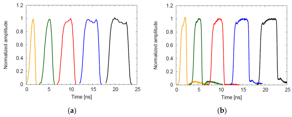 A second comparison can be made by exciting the sensor with a short laser pulse, in this case a 70-ps FWHM laser, progressively increasing the relative delay. The analog output then follows the shape of the gating window performed by the pixel. In Figure 11 this measurement has been repeated for windows width of approximately 1, 2, 3, 4, 5 ns; in both cases, the different window widths have been programmed to the internal logic which is stabilized against variations using a locked control loop with a reference clock. In this case it can be observed that edges of gating windows are better defined in Figure 11b: the motivation lays in the technique used to start and close the windows, avoiding the use of a monostable.