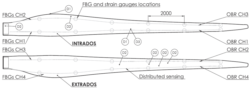 - Sierra-Pérez, J.; Torres-Arredondo, M.A.; Güemes, A. Damage and nonlinearities detection in wind turbine blades based on strain field pattern recognition. FBGs, OBR and strain gauges comparison. Compos. Struct. 2016, 135, 156–166. [Google Scholar] [CrossRef]