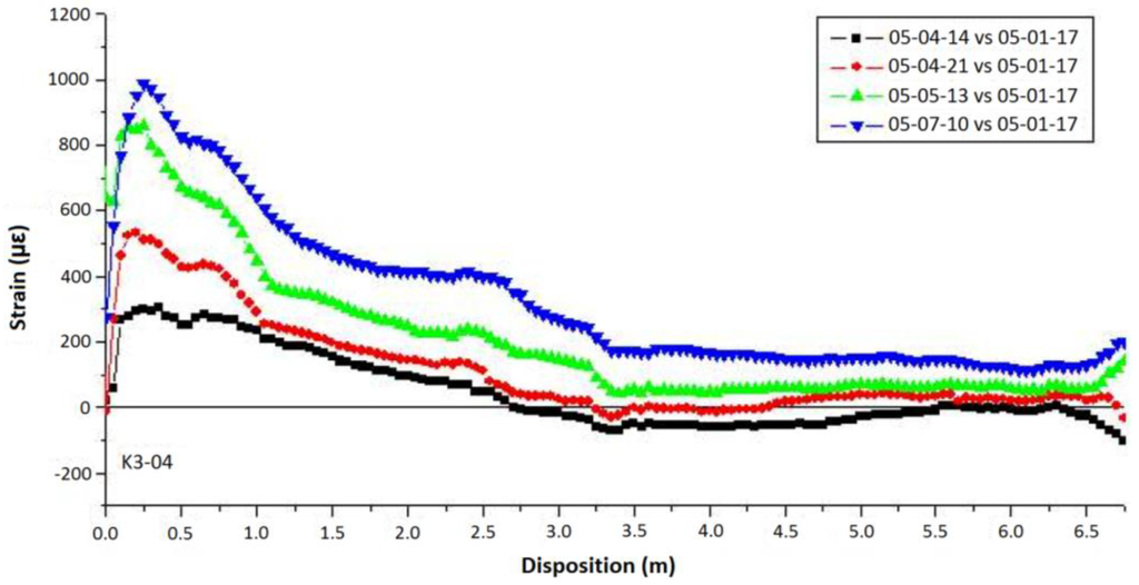 - Gue, C.Y.; Wilcock, M.; Alhaddad, M.M.; Elshafie, M.Z.E.B.; Soga, K.; Mair, R.J. The monitoring of an existing cast iron tunnel with distributed fibre optic sensing (DFOS). J. Civ. Struct. Health Monit. 2015, 5, 573–586. [Google Scholar] [CrossRef]