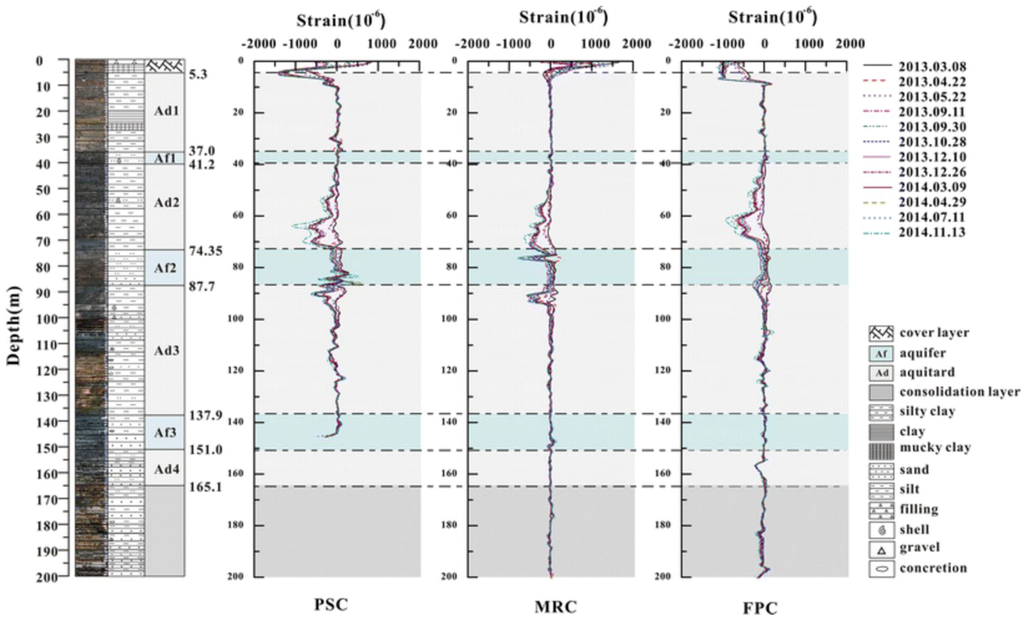 - Wu, J.; Jiang, H.; Su, J.; Shi, B.; Jiang, Y.; Gu, K. Application of distributed fiber optic sensing technique in land subsidence monitoring. J. Civ. Struct. Health Monit. 2015, 5, 587–597. [Google Scholar] [CrossRef]