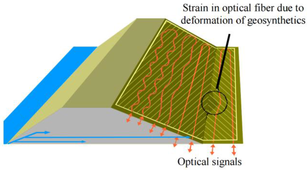 - Henault, J.-M.; Moreau, G.; Blairon, S.; Salin, J.; Courivaud, J.-R.; Taillade, F.; Merliot, E.; Dubois, J.-P.; Bertrand, J.; Buschaert, S.; et al. Truly distributed optical fiber sensors for structural health monitoring: From the telecommunication optical fiber drawling tower to water leakage detection in dikes and concrete structure strain monitoring. Adv. Civ. Eng. 2010, 2010. [Google Scholar] [CrossRef]