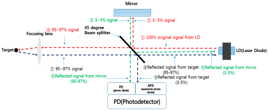 The two returned signal beams (⑤, ⑨) arrive in the photodetector, which is organized by PD and APD. These two returned signal beams have a phase difference between reference signal beam and target signal beam due to a time delay according to the distance differences between the mirror and object. With two returned signal beams (⑤, ⑨), we can determine the distance through the calculation of the phase differences between the reference signal beam (⑤) that comes from the reflective mirror and the reflected target signal beam (⑨) that comes from the target in the photodetector. However, when the laser beam is reflected through the target, the laser beam is scattered and the intensity of radiation will be reduced. As a result, the strength of radiation that arrives at the photodetector is different according to the kind of surface, shape and material media of the reflective target, which causes an error in the distance measured by the optical sensor.
