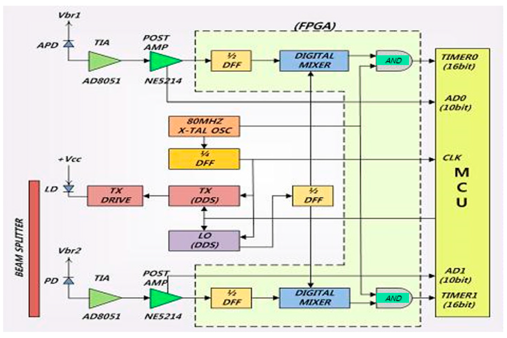 Figure 2 shows the configuration of an industrial optical sensor based on LDM for high precision. It consists of a field programmable gate array (FPGA) including the digital mixer, a beam splitter, APD, LD, PD, pre-amplification part, control part and its connecting microprocessor that controls the entire displacement of the optical sensor.